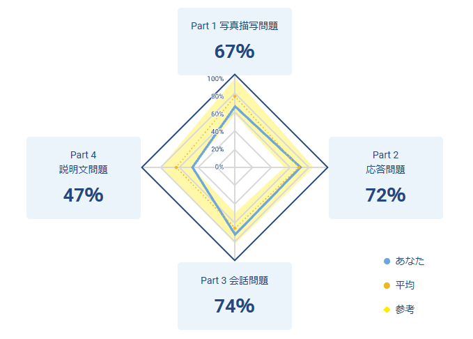 リスニングのスコア分布はこんな感じ。part4が明らかに苦手なんだな~。